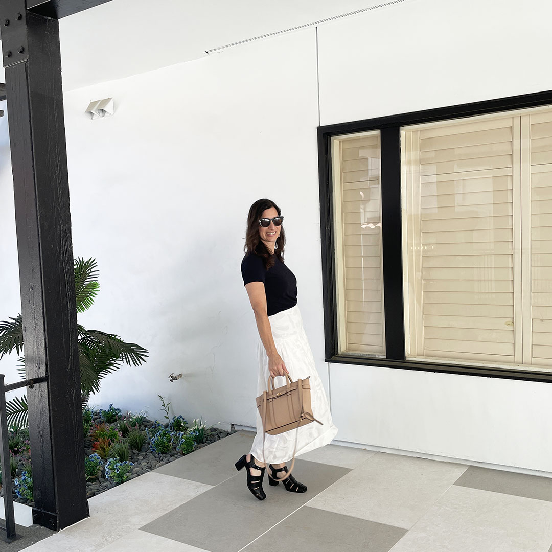 Since summer weather is here, I wore this lightweight white skirt, which is lined, paired with my favorite black tee. It is rare to find a white skirt with lining. As we all know, lining is a must when it comes to white! I look forward to also making this casual and pairing it with flip flop or espadrilles on beach days, or even warmer summer days!