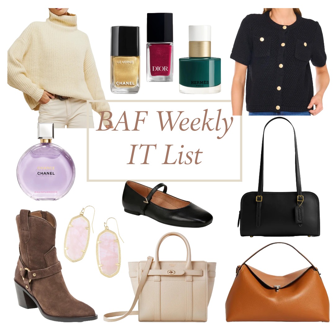 BAF Weekly IT List from top left: turtleneck sweater / Chanel nail polish / Dior nail polish / Hermes nail polish / short sleeve sweater / Chanel fragrance / east/west handbag / chocolate brown suede boots / pink statement earrings / black flats / belted tote / caramel top handle bag /