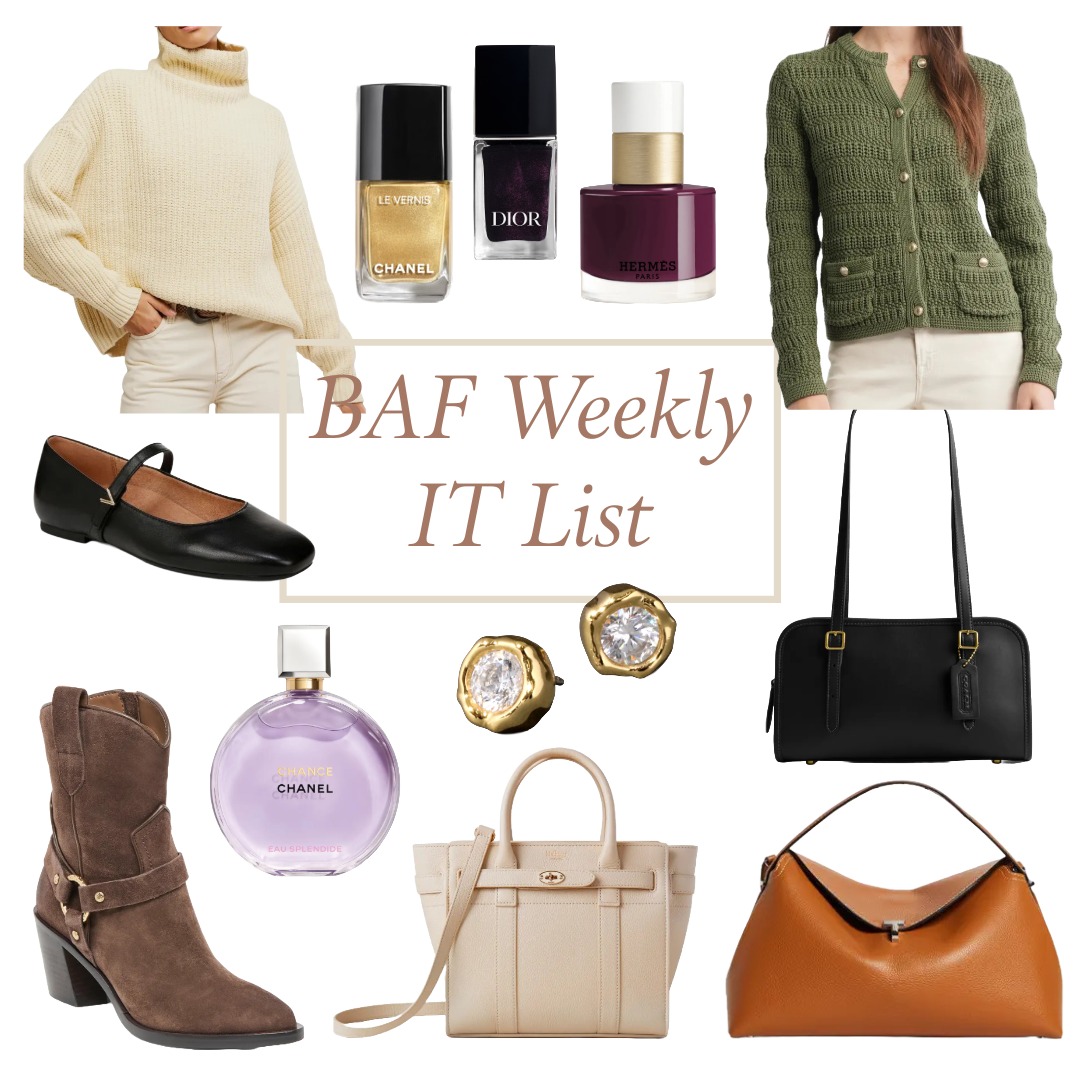 BAF Weekly IT List from top: turtleneck sweater / Chanel nail polish / Dior fall nail polish / Hermes fall nail polish / cardigan sweater / black flats / cz stud earrings / east/west bag / Chanel fragrance / chocolate brown suede boots / belted tote / caramel top handle bag /
