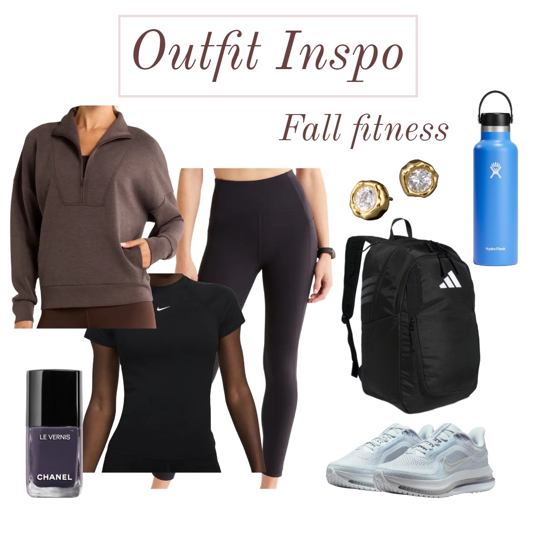 Fall fitness outfit from left: sweatshirt / holiday nail polish / black top / black leggings / earrings / water bottle / backpack / sneakers /