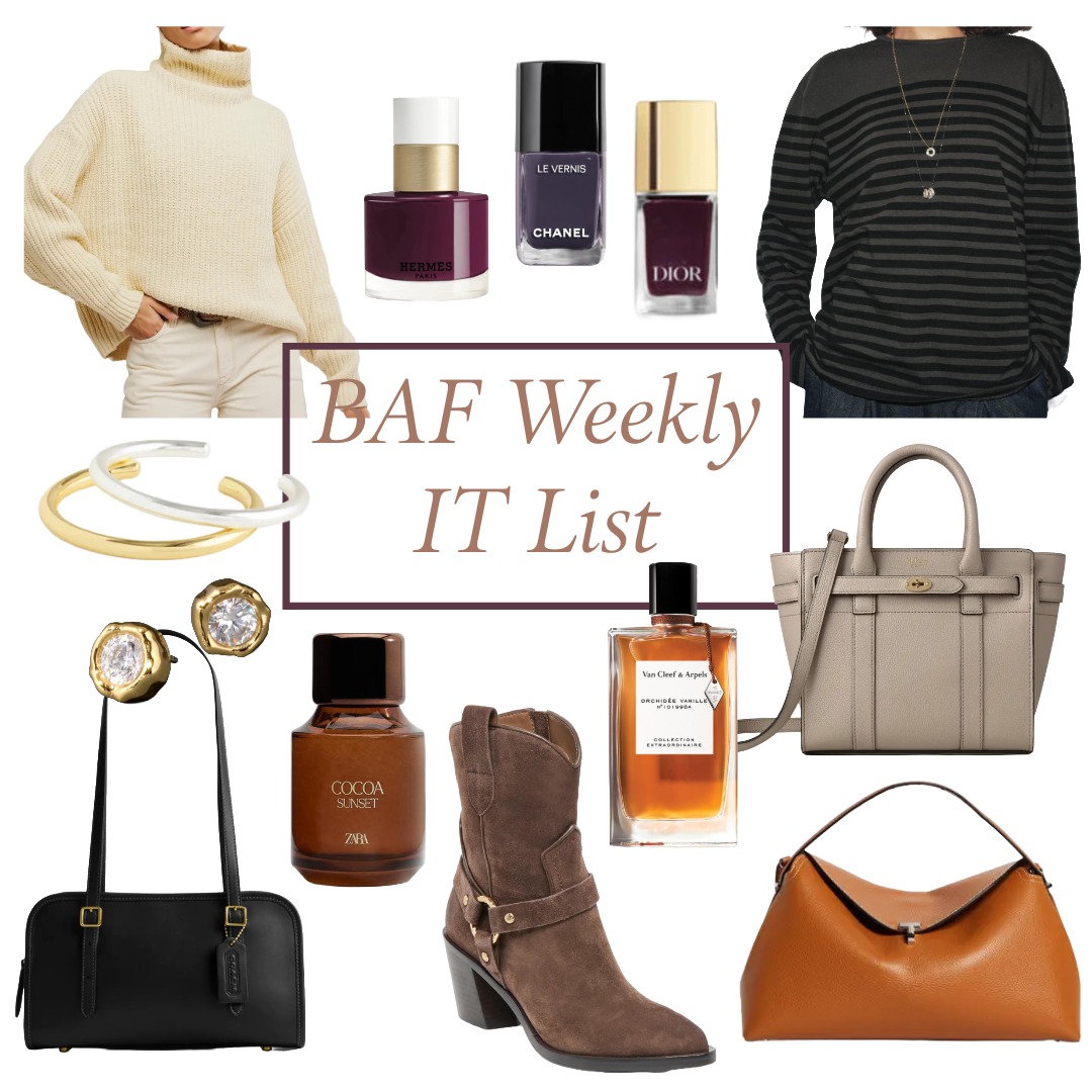 BAF Weekly IT List from top left: turtleneck sweater / Hermes fall nail polish / Chanel holiday nail polish / Dior holiday nail polish / stripe tee / bracelet set / CZ earrings / Cocoa Sunset edp / vanilla fragrance / belted tote / black east/west bag / chocolate brown suede boots / caramel top handle bag /
