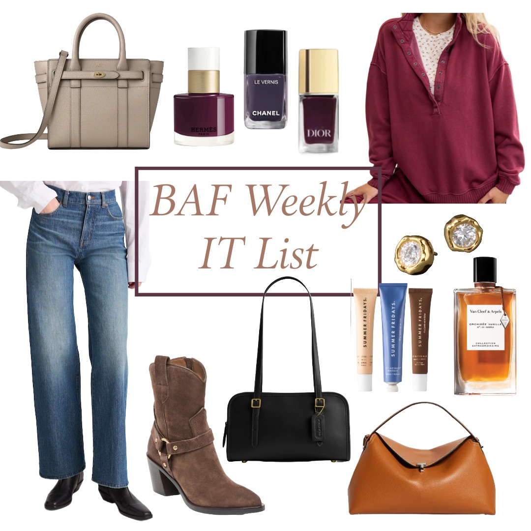 BAF Weekly IT List from top left: belted tote / Hermes nail polish / Chanel holiday nail polish / Dior holiday nail polish / sweatshirt / wide leg jeans / CZ earrings / chocolate brown suede boots / east/west bag / Summer Fridays gift set / caramel top handle bag / vanilla edp /