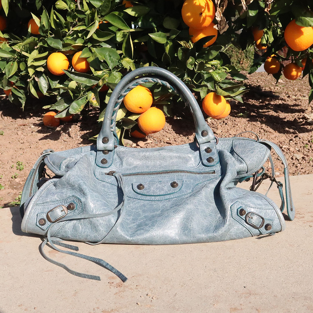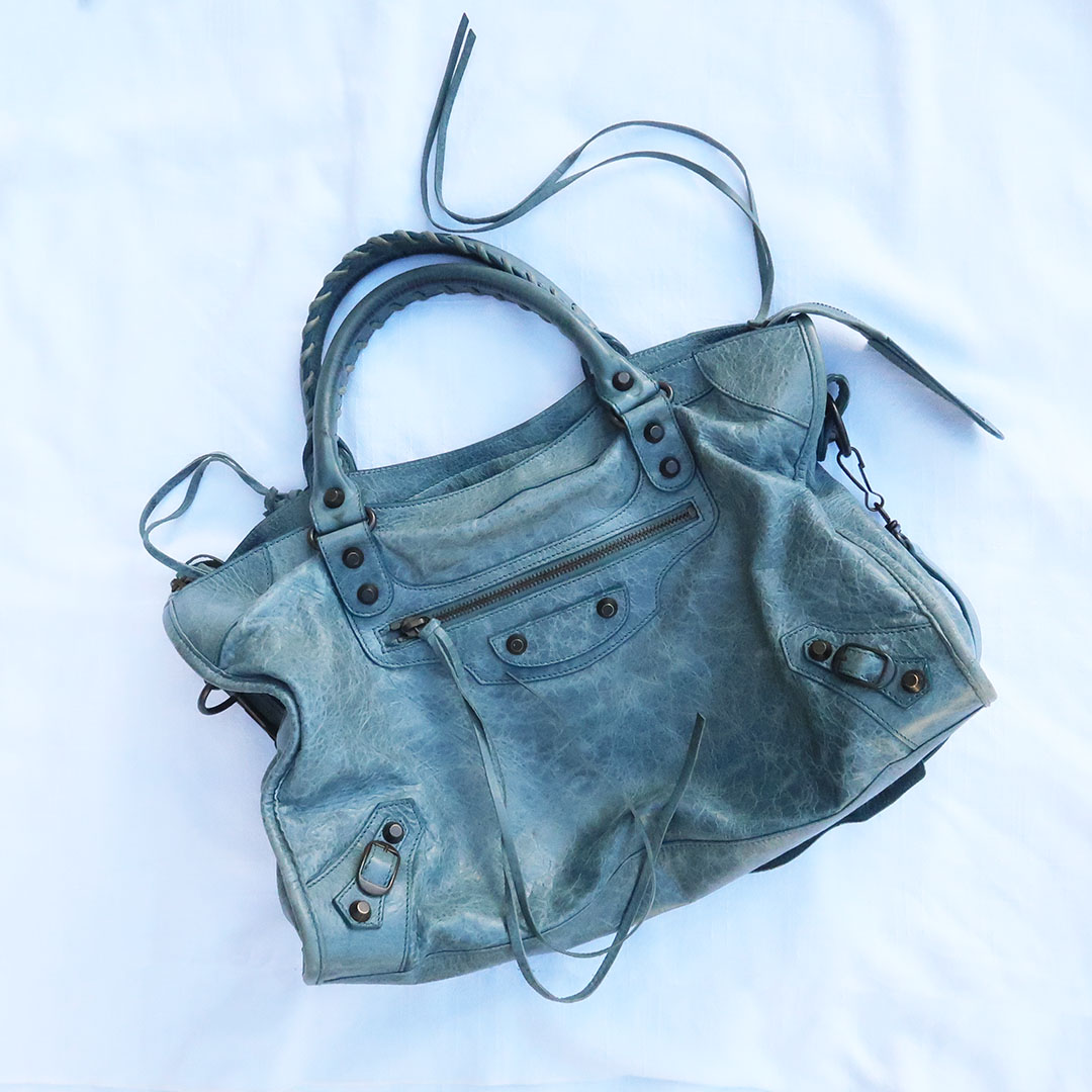 The Balenciaga City Bag was iconic in the early 2000’s. I snapped up mine in 2009. It was originally a light, denim blue but has faded to more of a grey-blue. Colored leather is always susceptible to fading and color changes. For a more stable color, I recommend natural colors and also black. That being said, I still love the color it has become over the years.