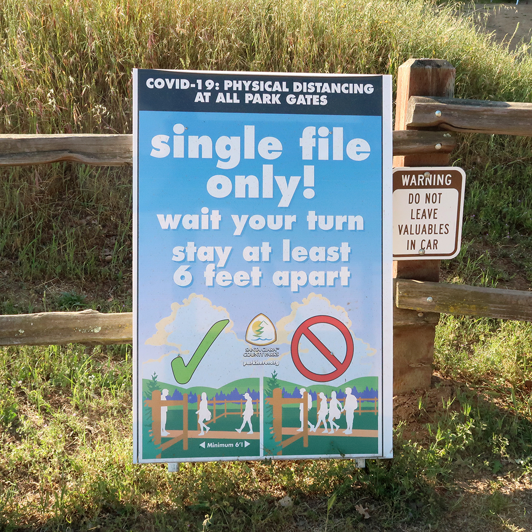 Santa Clara County has done a really good job of posting large signs at trail-heads in order to ensure everyone is reminded to social distance while hiking on the trails. I would say about 90% of the hikers we encountered while on the trails were adhering to our county social distancing requirements. We did encounter one group of three families who obviously didn’t live together, hiking in regular clothing without masks. They took up the whole trail and were just standing there talking and not moving aside for hikers, runners, and walkers. Other than that group, everyone else we passed was in single file, and roughly 75% of the people we saw had a mask of some sort.