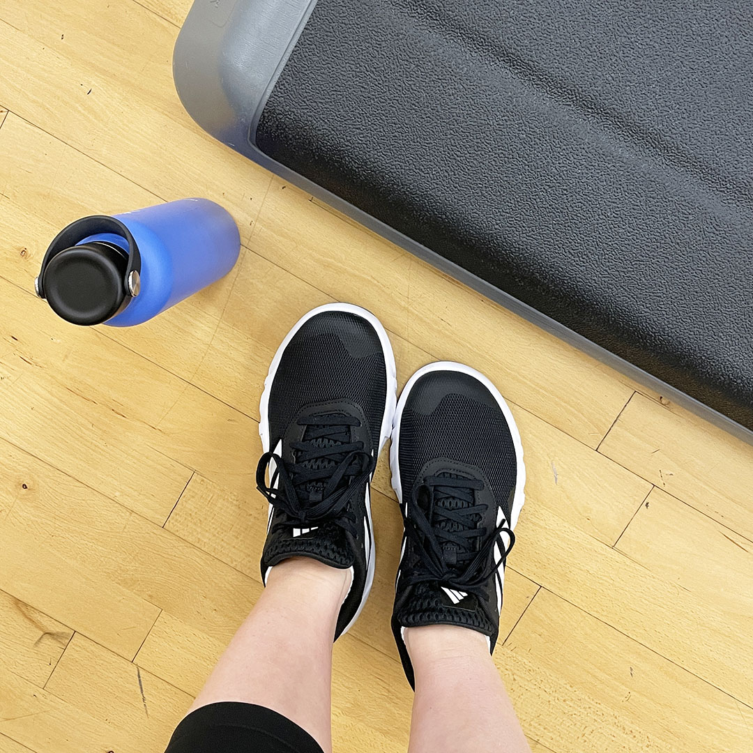 pictured: water bottle / sneakers / leggings /